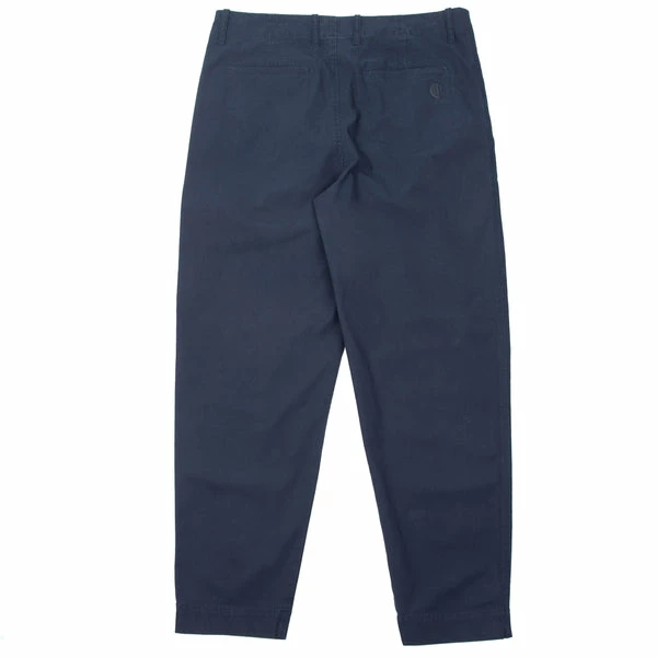 Loose, tapered shape and cropped length with peat detail at front. Grown on waistband with self fabric belt loops. Concealed button closure at fly with corozo nut buttons; top button at w/band exposed. Style is unlined and neatly bound internally in 100% cotton poplin. Crisp, compact ripstop fabric in GOTS certified organic cotton. Style is garment washed for lived-in feel. Organic cotton is an important choice for sustainable fashion. By choosing organic you are supporting a system which protects the ability of the soil to capture carbon and safeguards the health of farmers, garment workers and all those involved in making this garment. Composition: 97% GOTS Organic Cotton, 3% Spandex Care: Cool machine wash