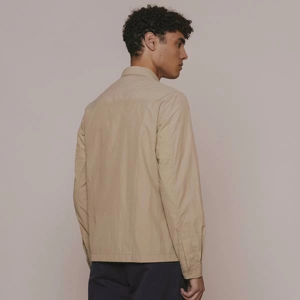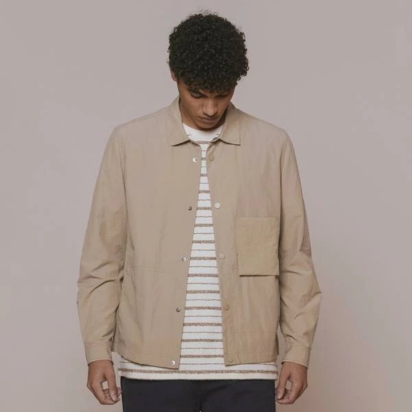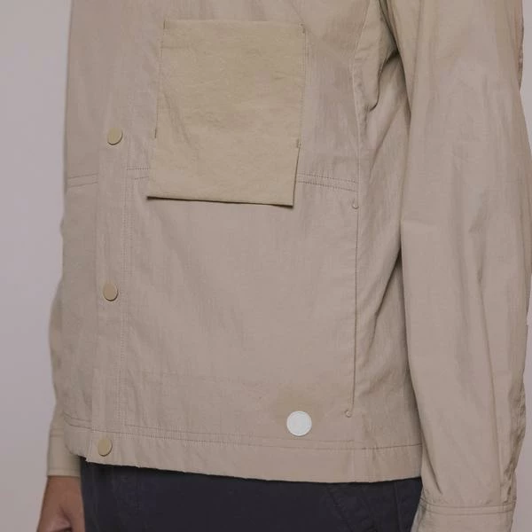 A boxy, short jacket block with shirt collar – Metal snap stud closure – Main body in lightweight sporty nylon ripstop – Clean in-seam pockets at front with miniature metal rivet detail securing the top and bottom and profile stitch detail – Additional square patch pocket that overlaps main pockets with bottom edge detail – Triangular insert detail at back sleeve – Additional pocket and back triangular sleeve insert in contrasting nylon fabric – Unlined internally and neatly bound; only front panels lined in 100% cotton poplin 77% Nylon, 23% Cotton Machine wash FM5301W