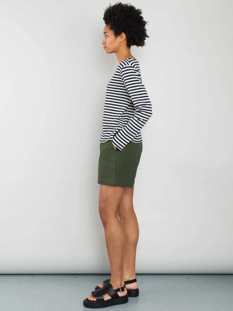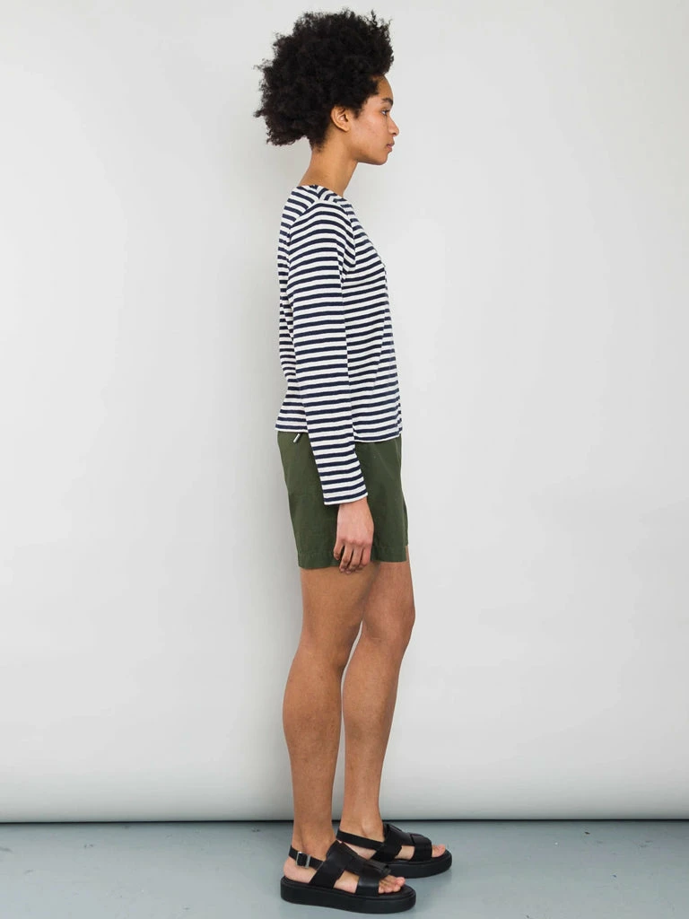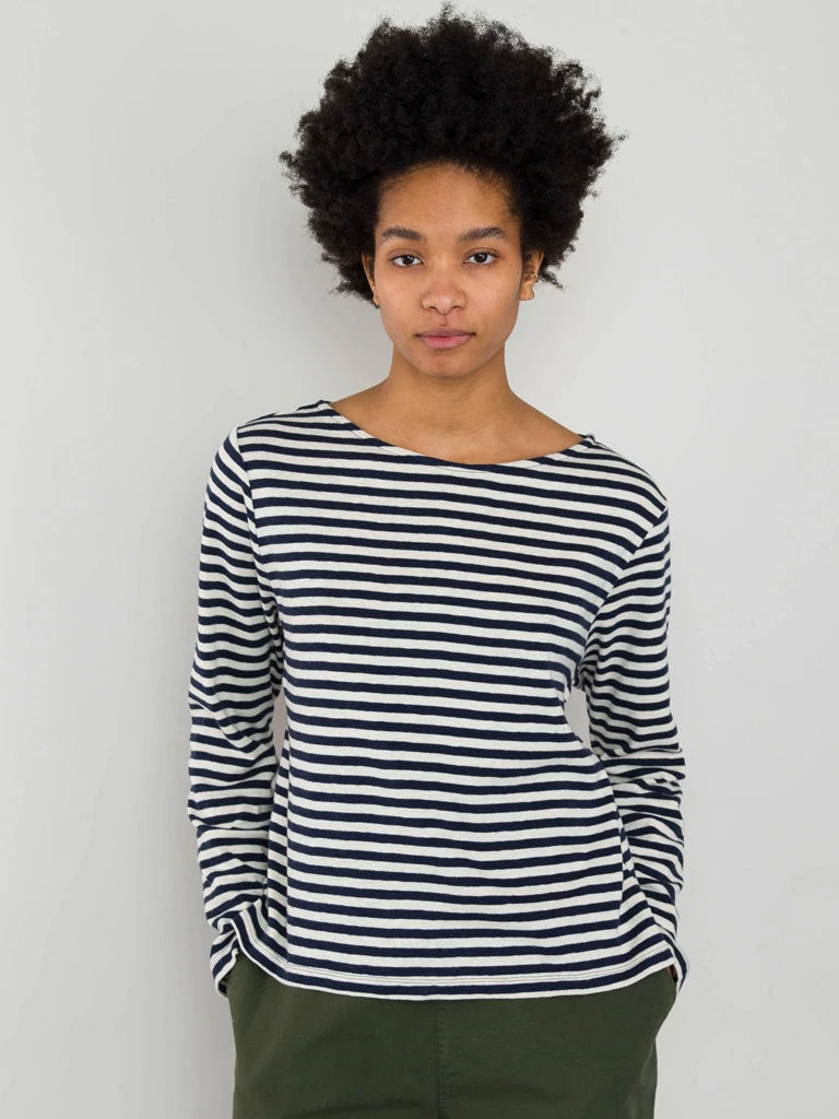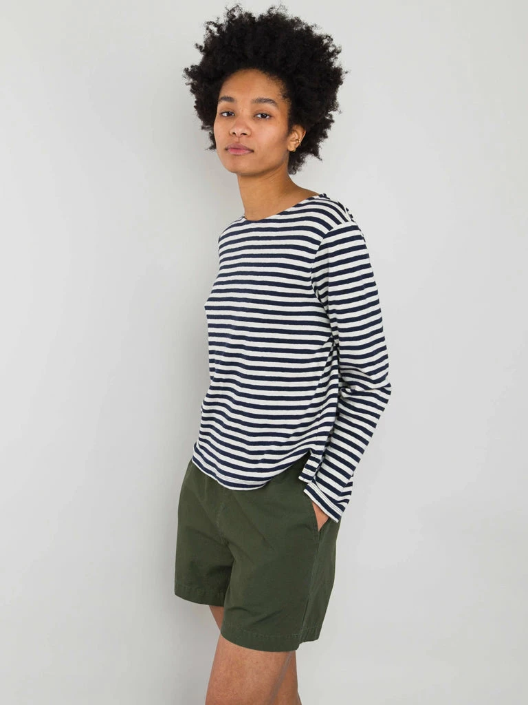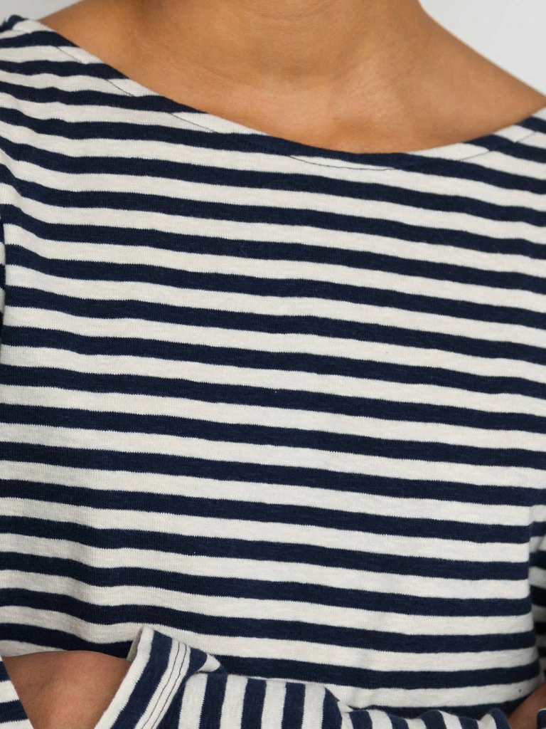 The Boat Neck T-Shirt from Folk is a wardrobe essential, the flattering neckline is complemented by the mid-length sleeve. Crafted from slubby cotton jersey in an irregular stripe design the t-shirt is super versatile. 100% Cotton Boat neck striped t-shirt Mid-length sleeve Side hem splits with contrast cotton tape facing. Offered in slubby cotton jersey, in an irregular stripe design. Model is 5’8″ and is wears a size 10