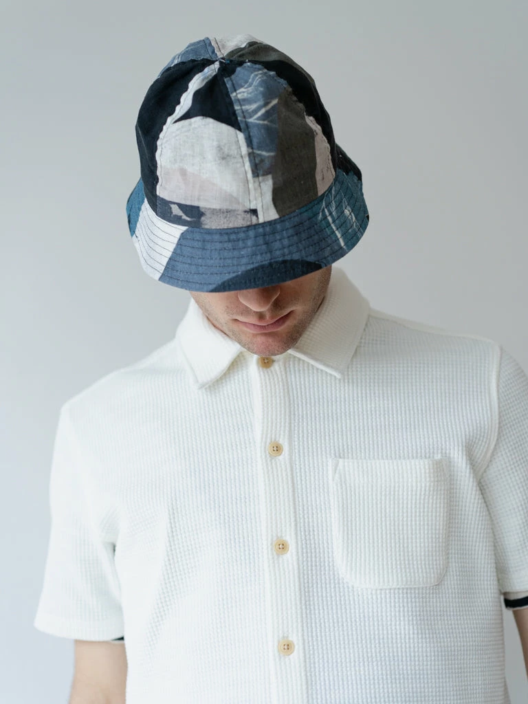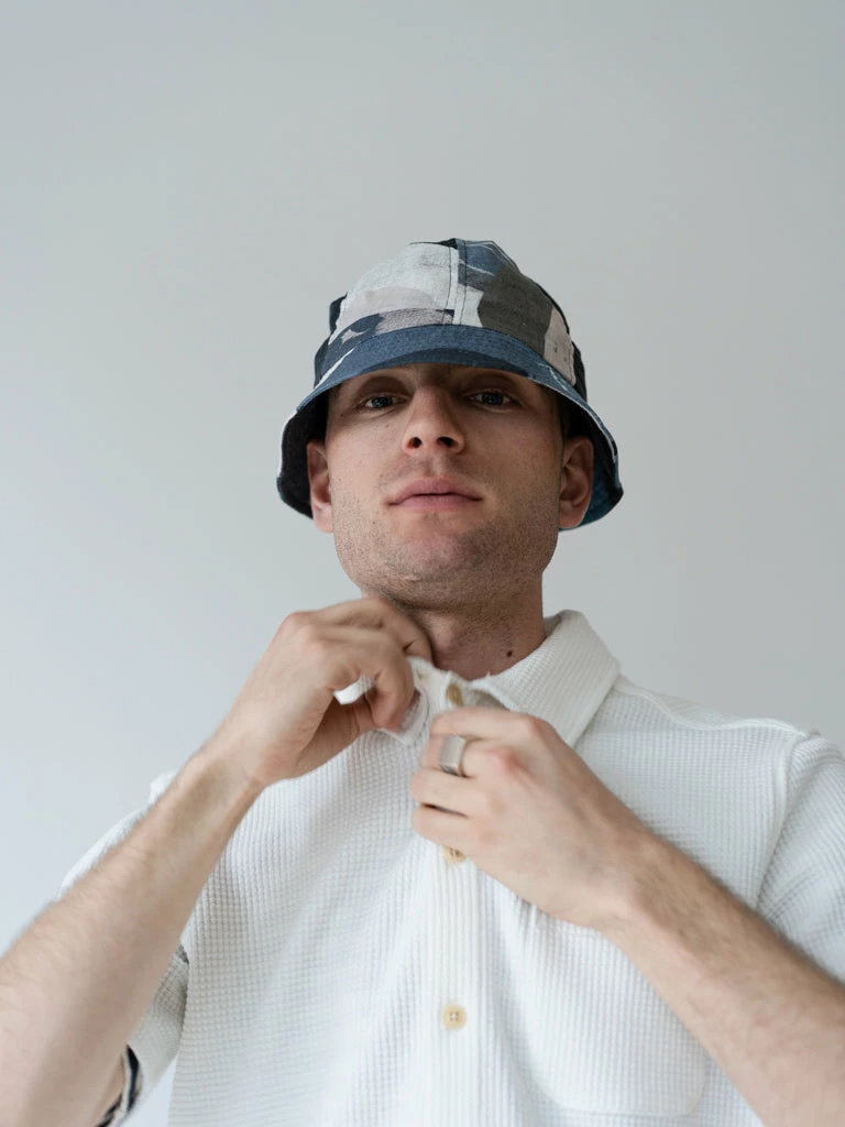 The Folk Bucket Hat has a soft, rounded bucket shape. Crafted in 100% linen, the hat has a unique geometric print and is finished with embroidered eyelets and stitching detail around the brim. 100% Linen Bucket hat in unique geometric pattern Embroidered eyelets; tonal to shell colour Rubber circle FOLK logo at back