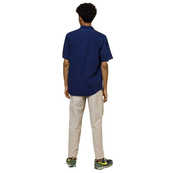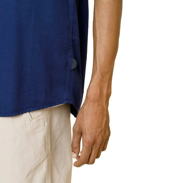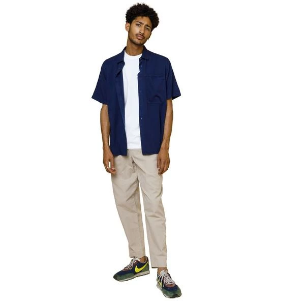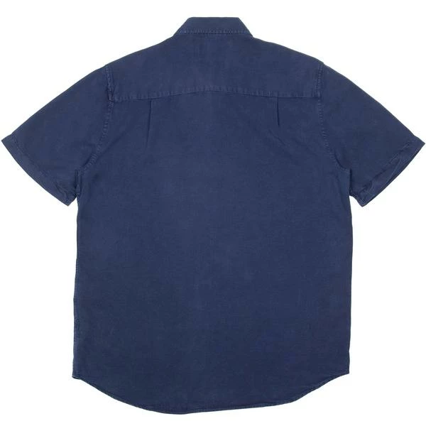 A relaxed fit short sleeve shirt with a classic shirt collar and subtle detailing of a horizontal seam across the chest, above the rectangular patch pocket in self fabric. Curved hem and short sleeves Grown on placket with corozo nut button closure & box stitch detail Back yoke with pleats Garment dyed, giving depth and character of colour 75% Lyocell, 25% Recycled Lyocell Care: Machine wash cold and iron cool