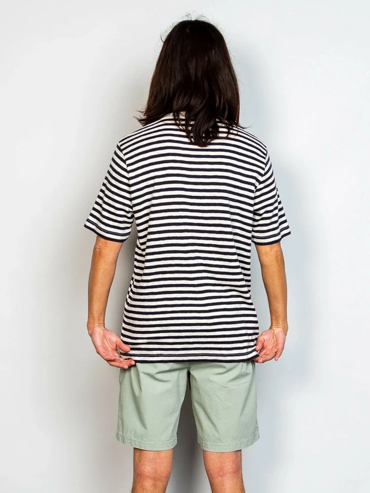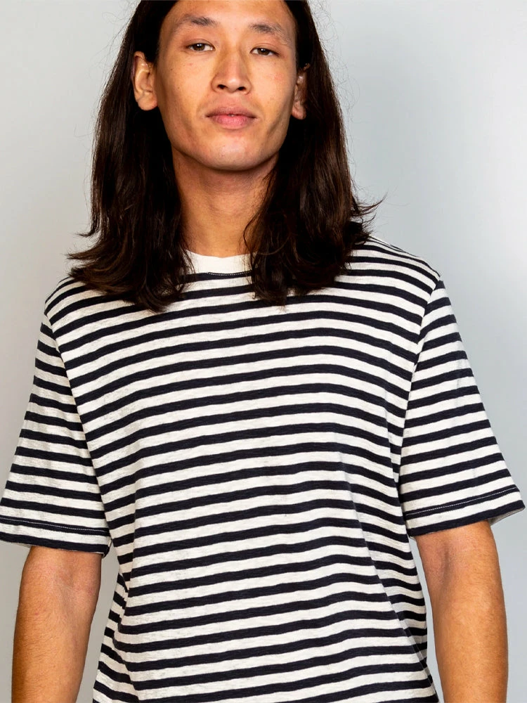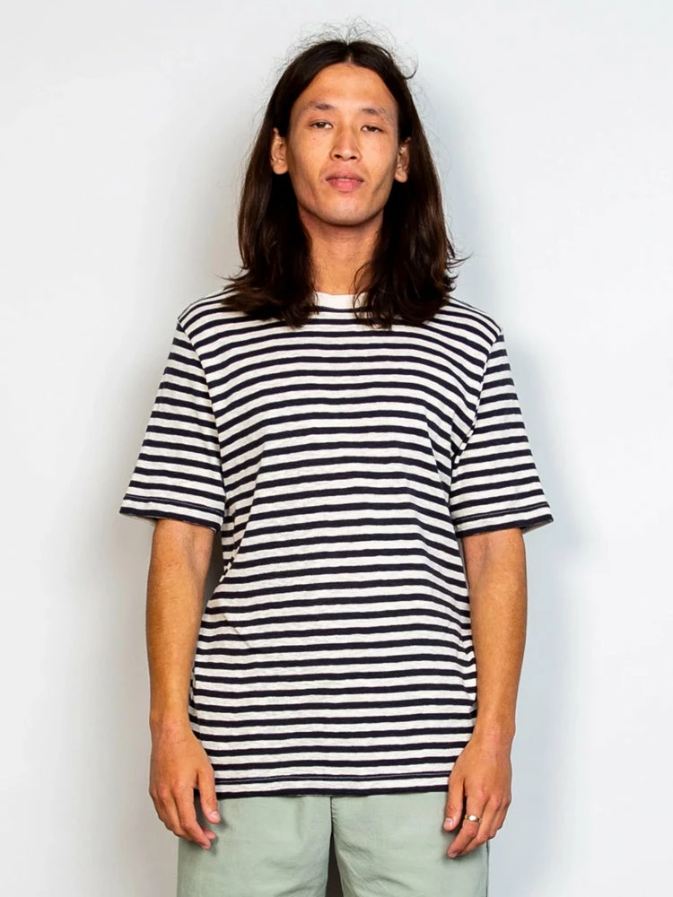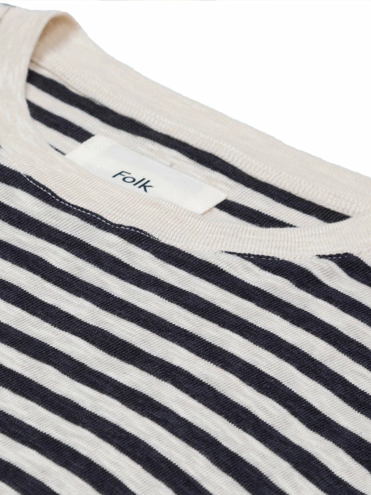 Folk’s regular fit short sleeve T-Shirt in a Classic Stripe design features a 1×1 inserted rib crew neck collar with twin-needle finishes at the hem, sleeves and cuffs. The tee comes in 100% cotton single jersey fabric with a slubby texture. 100% Cotton Regular fit short sleeve tee in a classic stripe design 1×1 Inserted rib crew neck collar Cotton single jersey fabric with slubby texture. Narrow printed stripe design Twin-needle finish at hem and sleeve cuffs