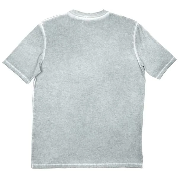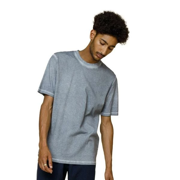 A regular, loose fit tee, constructed with a lighter weight, smooth 100% cotton single jersey sleeve and a heavier weight 100% cotton single jersey body. 100% Cotton 1×1 rib crew neck collar Cold dye process uses vegetable dye stuff and the garment is dipped; creating the uneven spread of colour Care: Machine wash cold Model is 6ft and wears size M