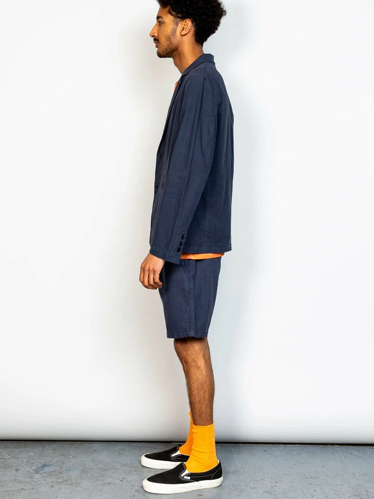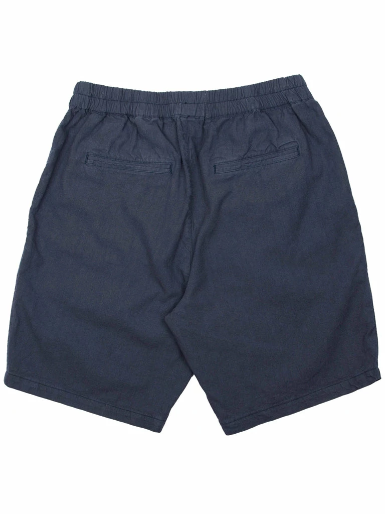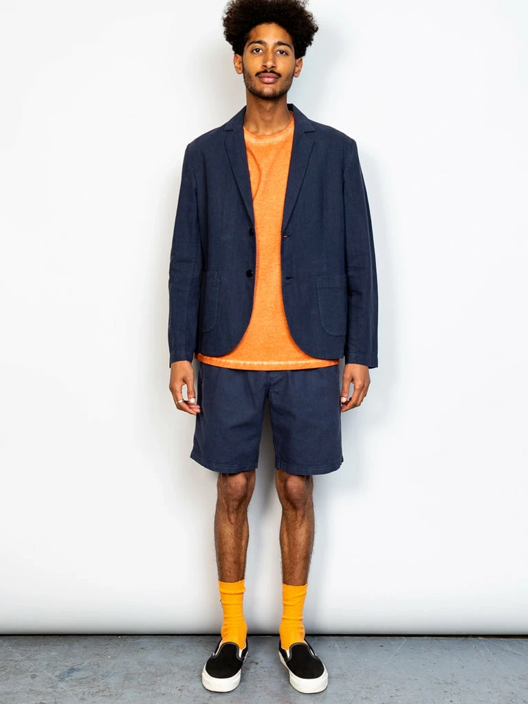 The Cotton Linen Shorts from Folk feature an elasticated waistband with drawcord finished internally through embroidered eyelets, straight twin jet pockets at the back with barracks and slanted welt pockets at front. The shorts have been garment dyed to give depth and character of colour. 55% Linen, 45% Cotton Regular short block Elasticated waistband in self-fabric, with drawcord Drawcords are flat 100% cotton tape that matches to shell colour Drawcords finished with turned and stitched ends. Flat, self-fabric piping detail at outer leg seam Slanted welt pockets at front Straight twin jet pockets at the back with bartacks Style is garment dyed; giving depth and character of colour.