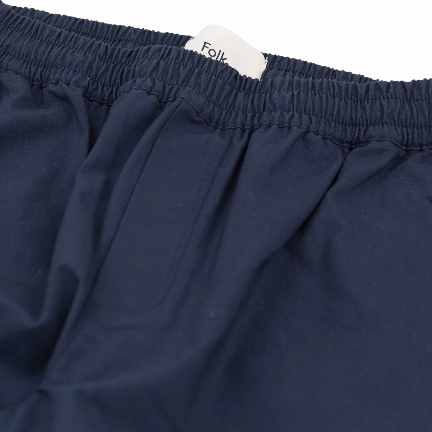 > Elasticated waistband with drawcords finishing internally through embroidered eyelets.