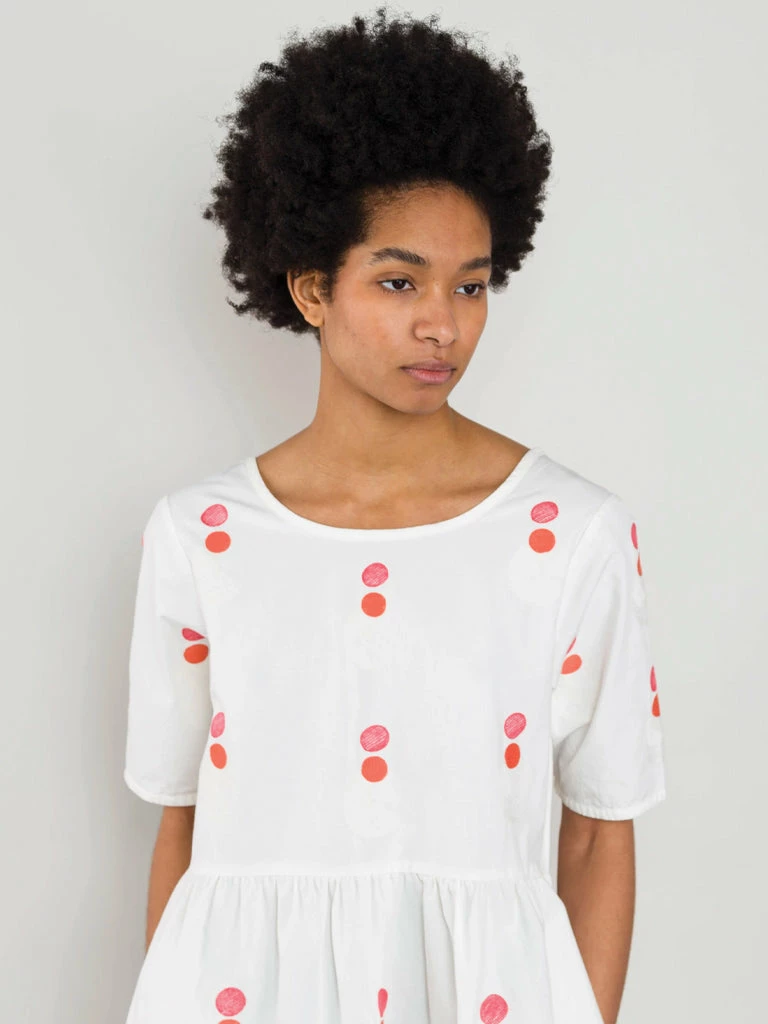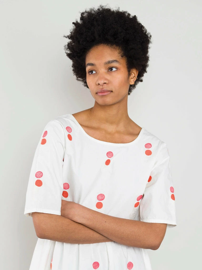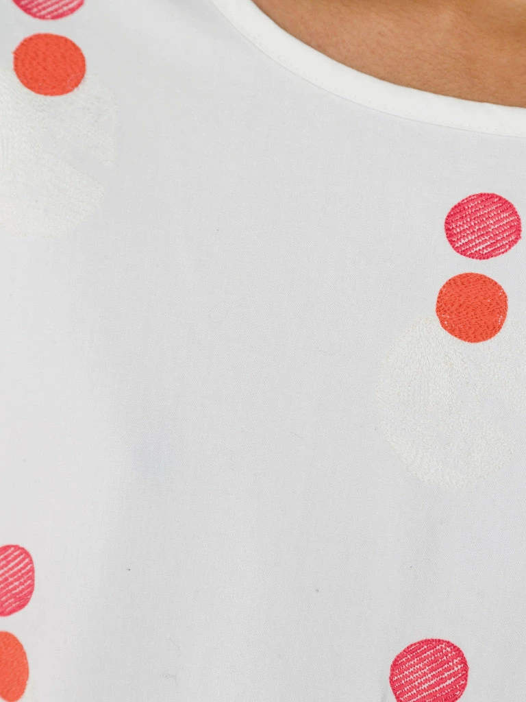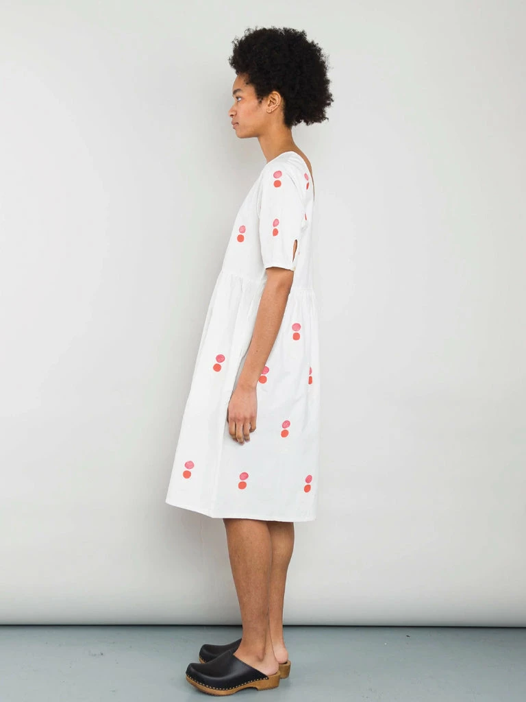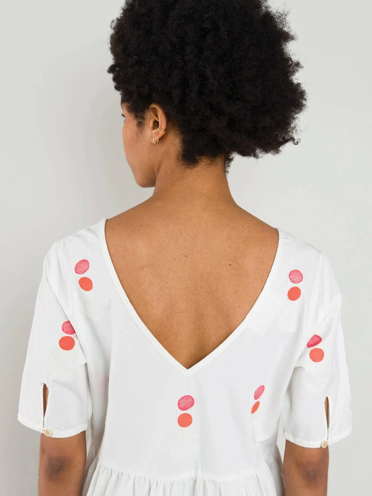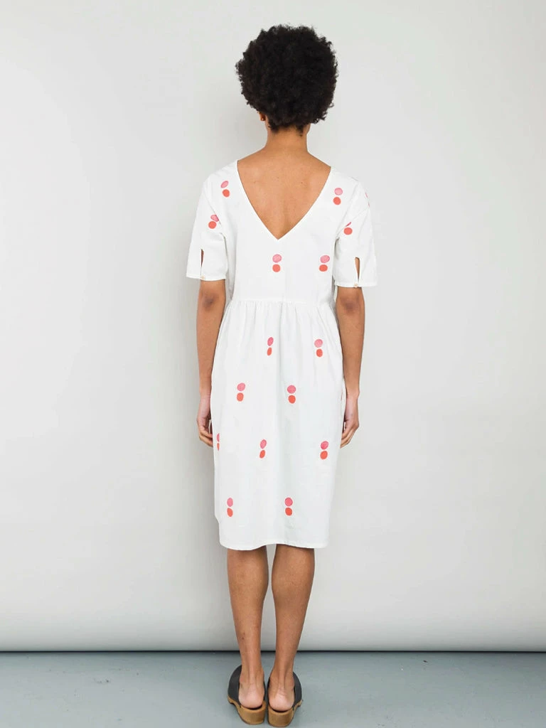 Crafted from 100% Cotton, the dress has a high scooped neck and low V back. Finished with two side seam pockets and a voluminous skirt. 100% Cotton Summer midi dress with embroidery and voluminous skirt Two side seam pockets Finishes below knee Embroidered Model is 5’8″ and is wearing a size 8