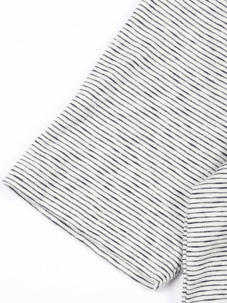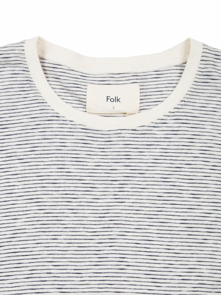 Folk’s Fine Stripe T-Shirt has a slightly looser feel with a slubby texture to the fabric. Crafted from 100% Cotton, the shirt is finished with double stitching used on the hem and cuffs and a contrasting collar. 100% Cotton Short sleeve tee in a classic stripe design Double stitch hem and cuffs Slubby texture. Fine stripe print Twin-needle finish at hem and sleeve cuffs