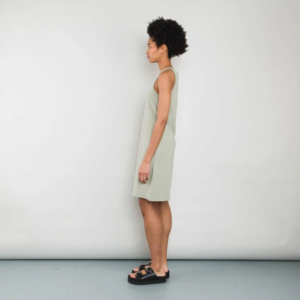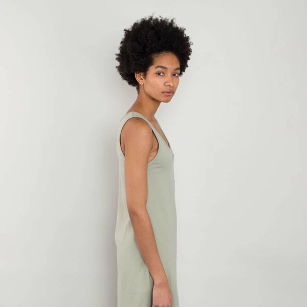 Classic fit scoop neck jersey dress Easy and versatile style. Summery cotton single jersey fabric with with slubby texture. Self fabric bound neck and armholes. Garment dyed; giving depth and character of colour. Model is 5’8″ and wears a size 2 Care: Cool machine wash