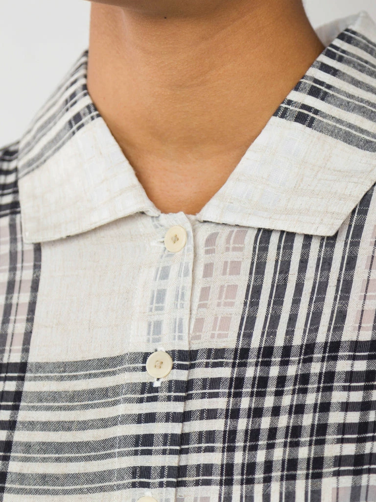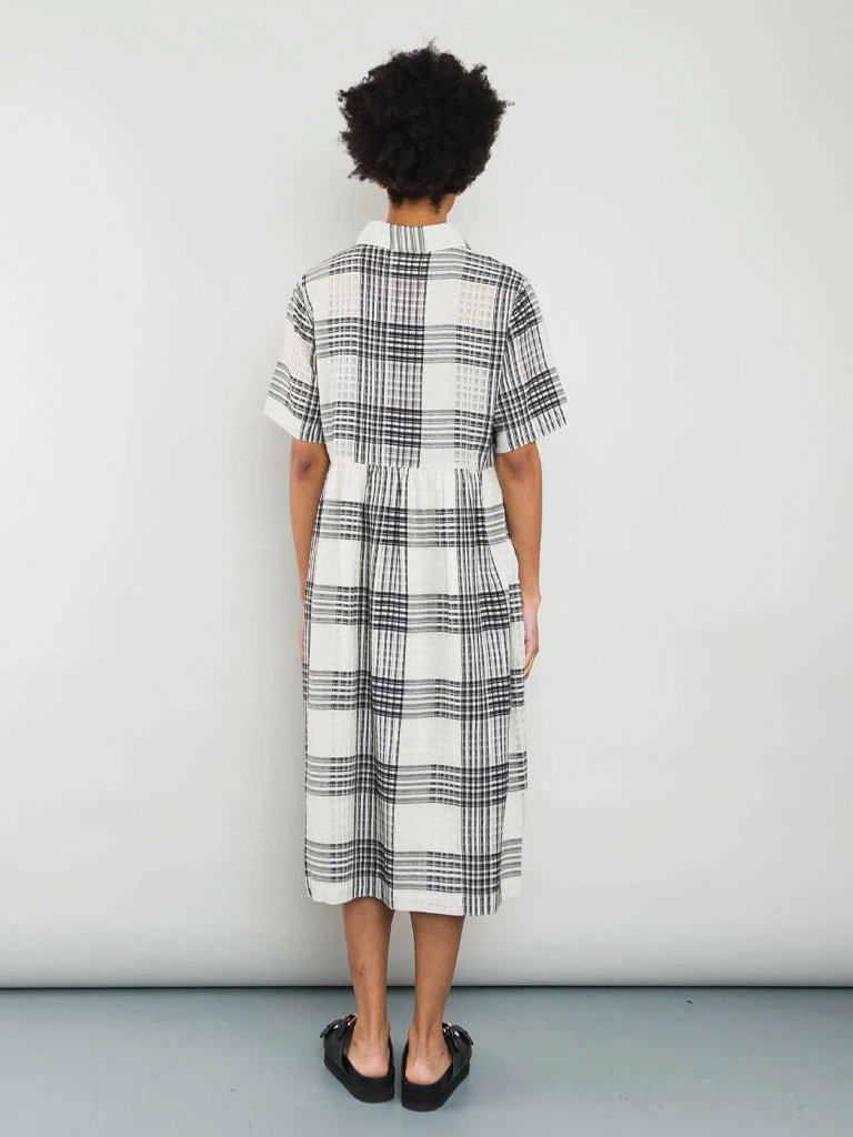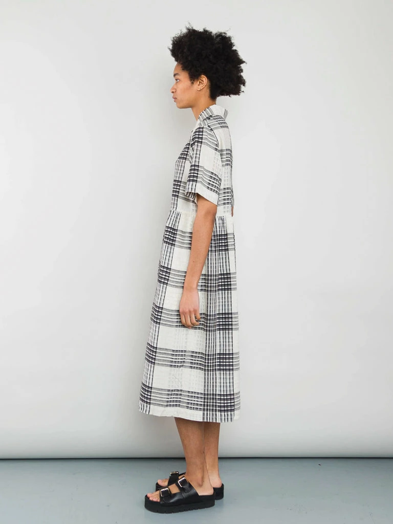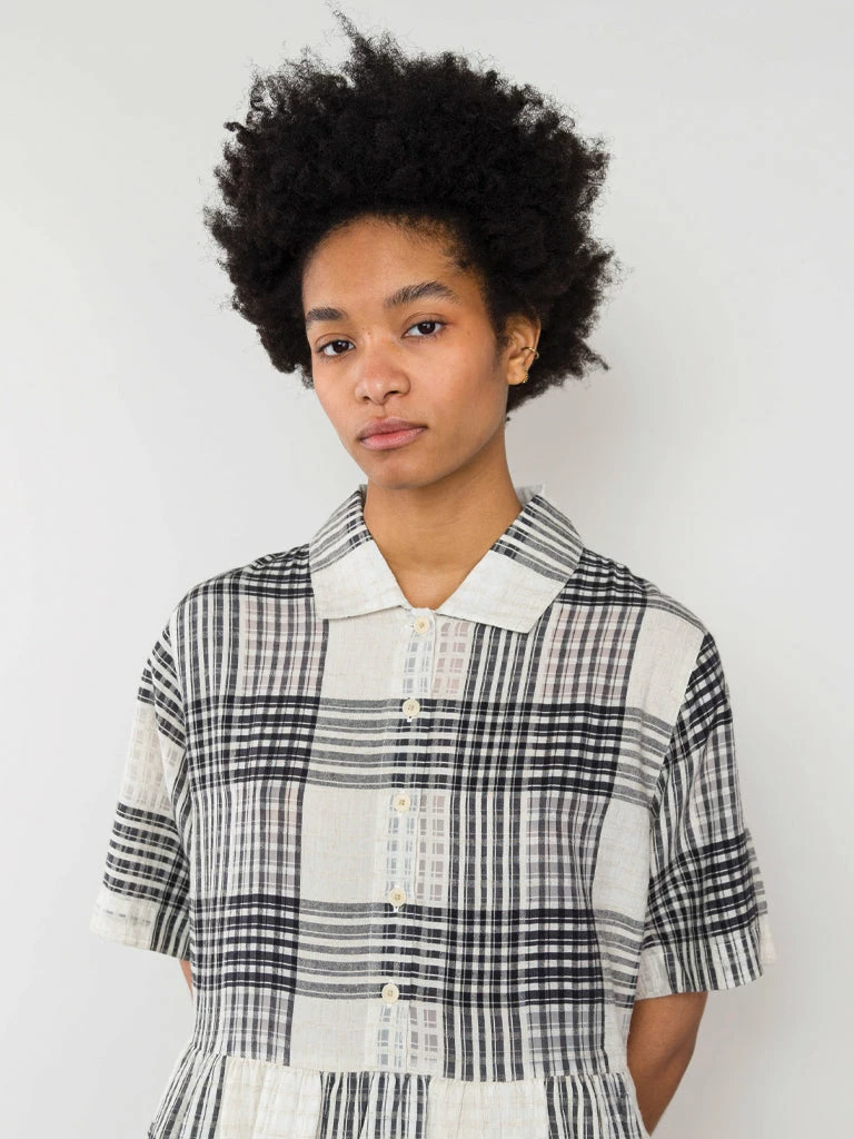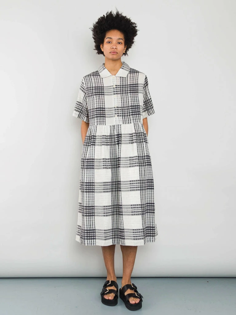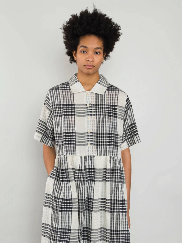 Folk’s Loom Dress comes in a oversized fit with a dropped waist, short sleeves and a voluminous skirt. The unique dress has been crafted in a tonal check design, allowing different levels of transparency. 100% Cotton Oversized Half button placket with a relaxed fit open collar Check pattern Dress is garment dyed giving a lived in hand feel and drape Machine wash The model is 5’8″ and wears size 8