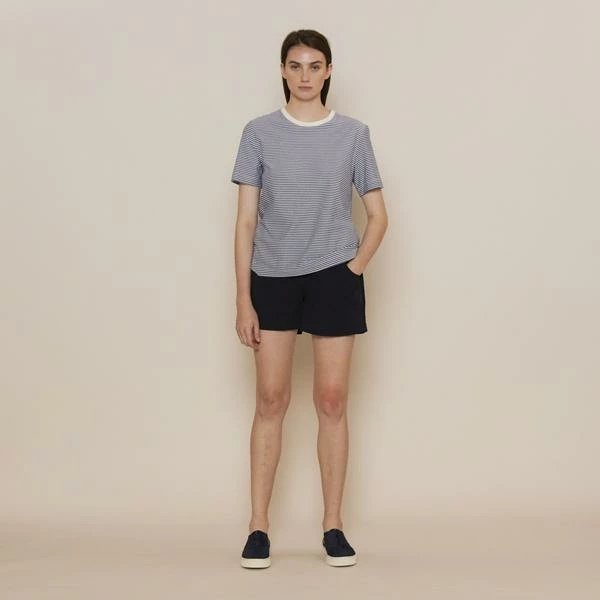 These elasticated waist shorts have been cut from a Japanese cotton and linen fabric with a slight crinkle finish. This style has front side pockets and a small coin pocket. Finished with a reverse seam detail at the outside leg. 75% cotton, 25% linen Machine Wash WFW3515