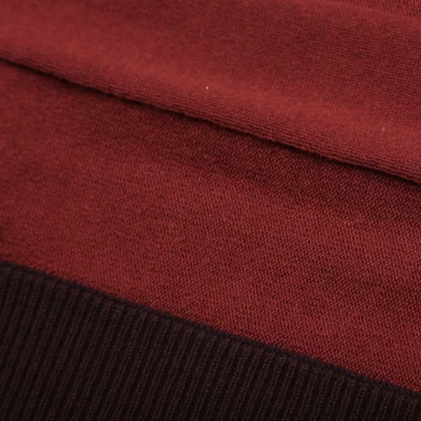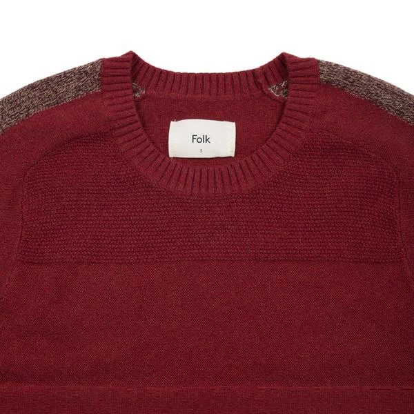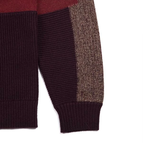 The Panel Texture Crew is finished with a 2×2 rib on cuffs, hem and collar. The yarn is a 2/15’s Merino Lambswool / cotton blend and it is knitted in a 7 gauge, meaning it is a good mid / transitional weight and handle. It is knitted using a combination of blocks of different colour and texture across the piece. It has saddle shoulders, with a block of the lightest colour running from the collar, down the upper sleeve to the cuff in a plain single jersey stitch. The under sleeve and body is then split into an upper section in the mid shade, and a lower section in the darker shade, which is in a 1×1 rib.