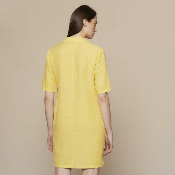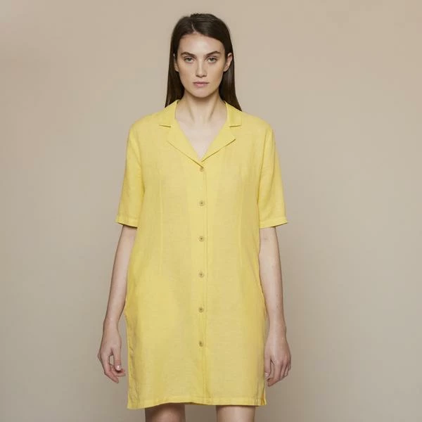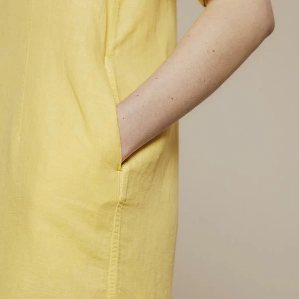 This casual, slightly shaped shirt dress has a camp collar and centre front, button fastening. This style finishes above the knee and has side pockets. Perfect for wearing on its own or layering over trousers/shorts. The light weight cotton and linen fabric has been garment dyed for a soft handfeel. The fabric of this garment was locally sourced in an effort to make environmentally conscious choices. 60% cotton, 40% linen Machine wash WFW3521