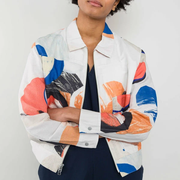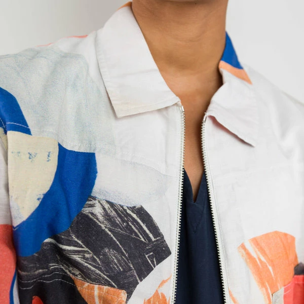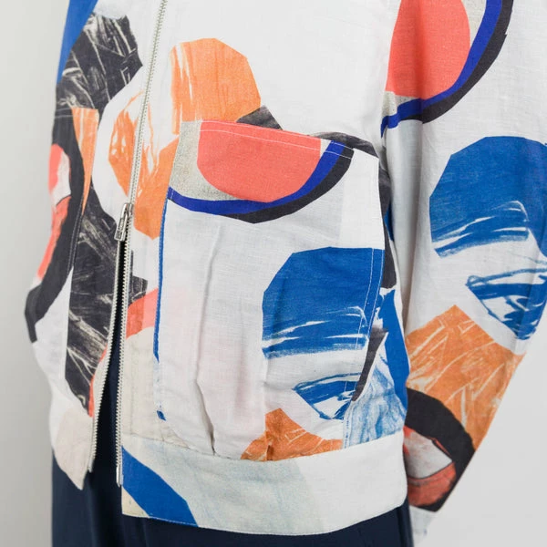 Boxy, shorter jacket block with shirt collar, offered in Folk original print design.Lined internally and neatly bound.Double tuck detail at back of garment. Double ended metal zip closure at centre front.Model is 5’8″ and is wearing a size 2 Note: Pattern placement may be different to that pictured. Composition: 100% LinenCare: Cool hand wash