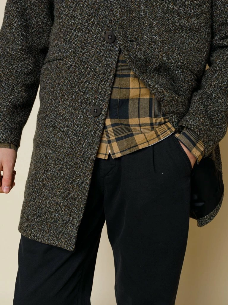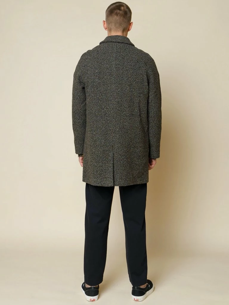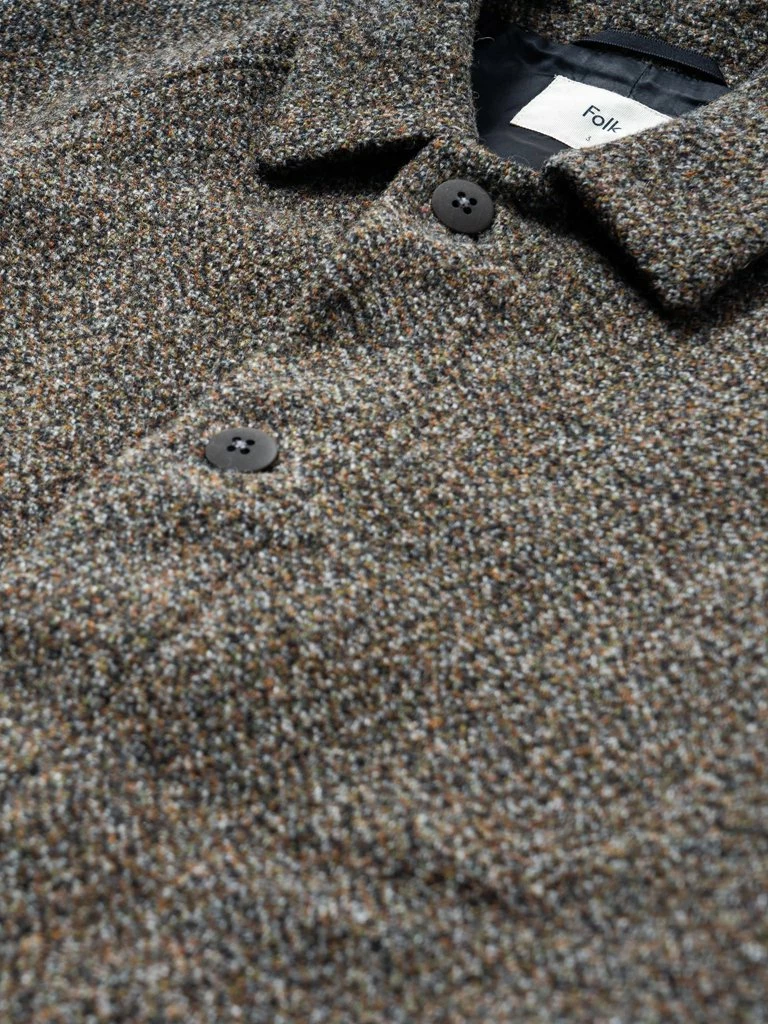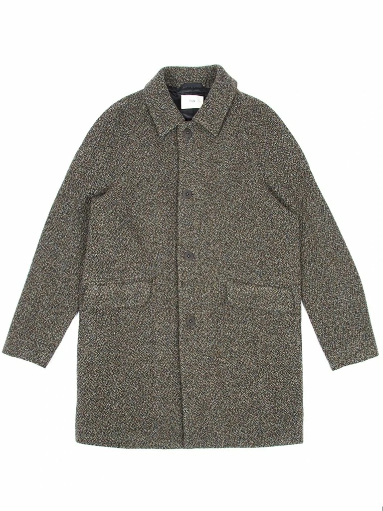 Folk’s Clean Car Coat is designed for the modern man. The sophisticated coat has been crafted in 100% Virgin wool from Italy that is heavily textured and designed in a rich mix of yarn colours. The mid length style comes single breasted with raglan sleeves and is fully lined internally. You’ll reach for this coat all season. Mid length, single breasted overcoat 100% Virgin Wool from Italy Raglan sleeve with dart detail running from neck down the sleeve 4 button closure at front with Folk’s unique square backing buttons Jetted buttonholes; top collar buttonhole is angled Slanted pockets at front body with self fabric flaps Felt under-collar Fully lined internally Unique internal pocket design with snap closure top flap covering a welt pocket Internal pocket bottom snap closure flap covers patch pocket All buttons corozo nut Centre back vent Dry clean only made in Portugal