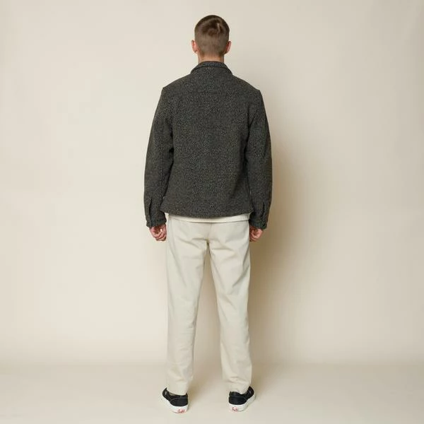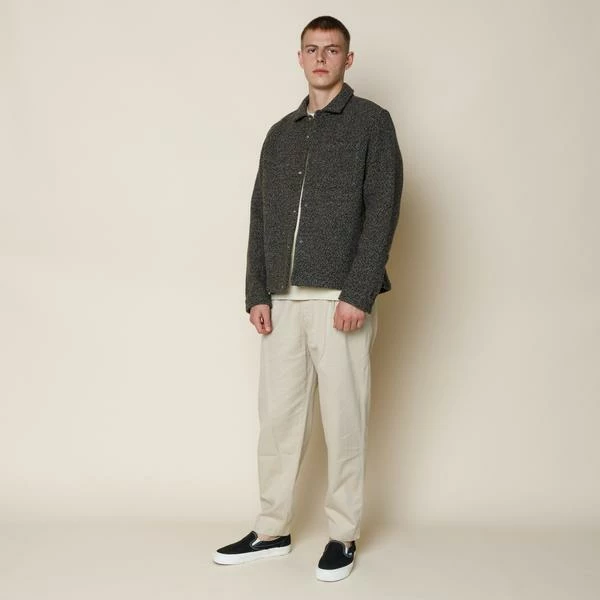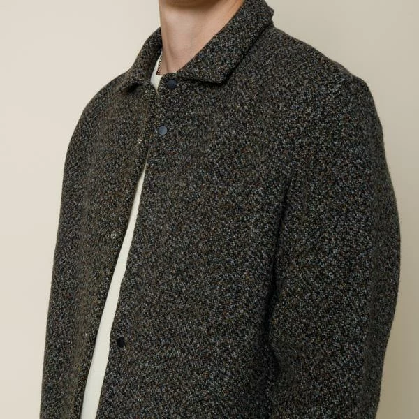 A boxy, short jacket block with shirt collar > Metal snap stud closure at front and cuffs > Clean in-seam pockets at front with miniature metal rivet detail securing at top and bottom > Square chest pocket > Unlined internally and neatly bound; only front panels lined in 100% cotton poplin > Slanted back seam detail > Stone Moss option is in a 100% wool fabric from Italy that is heavily textured, and in a rich mix of yarn colours 100% virgin wool | Dry clean only | made in Portugal