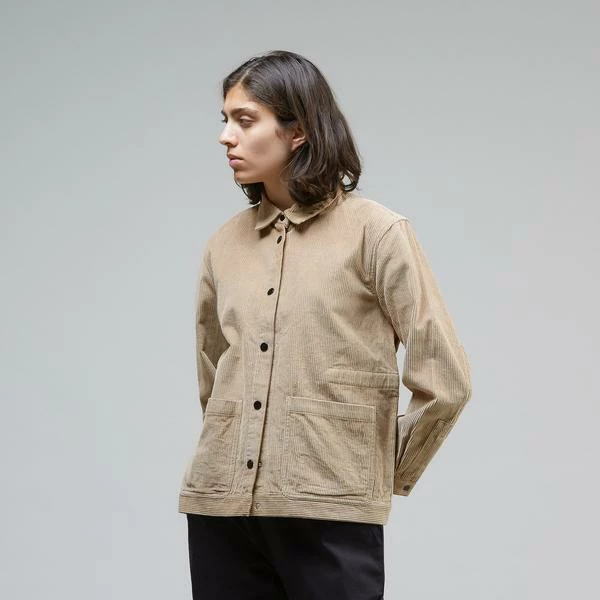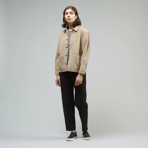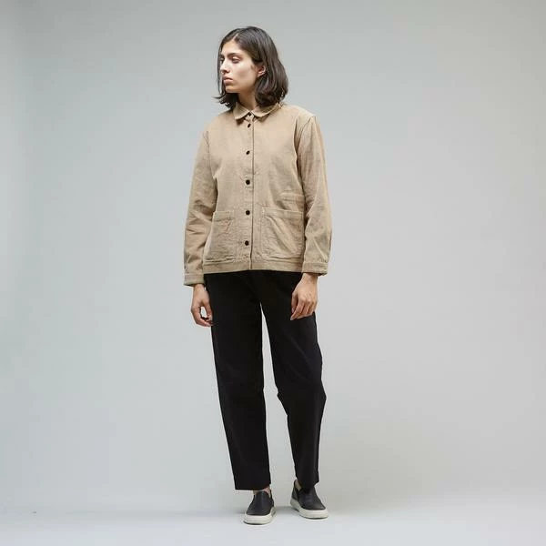 Workwear jacket in wide corduroy with a super soft handfeel. This style has a popper fastening and large patch pockets. The waist can be cinched in with a tubular grosgrain tape or left loose and boxy. 100% cotton