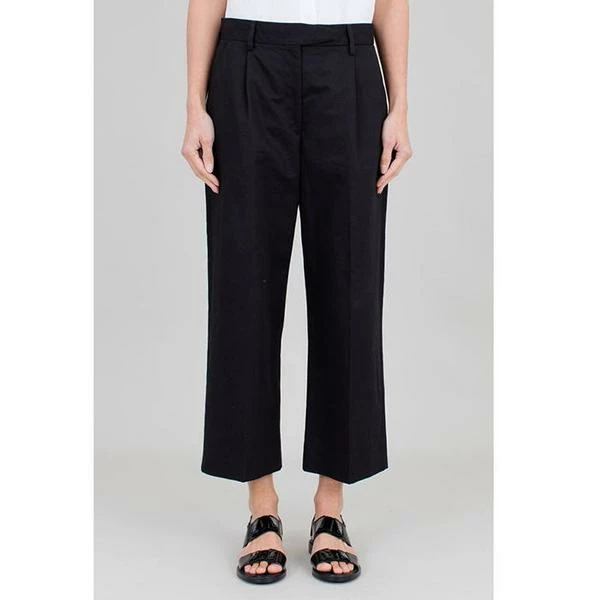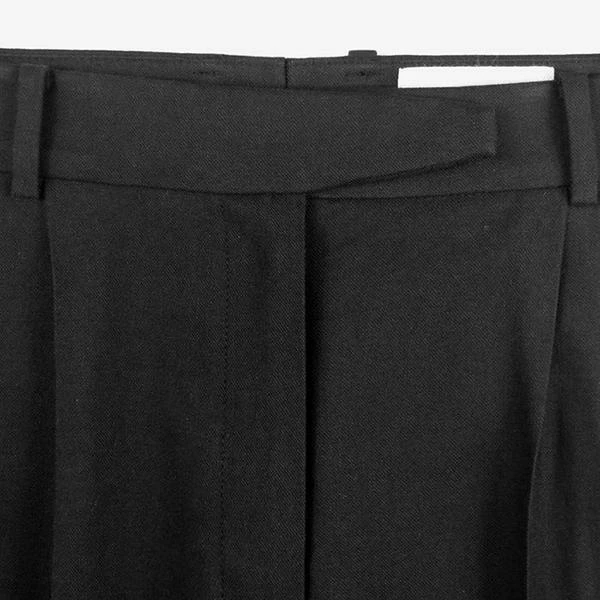 These relaxed wide tailored trousers in black are by London brand Folk. They are sartorially tailored trousers cut with a wide leg and a cropped length that finishes just above ankle. Hook & bar fastening at waistband over zip through fly. Belt hoops and side seam pockets with a single crisp pleat running down each leg. Two jetted pockets to rear. Fit true to size. Perfect with brogues or low heeled lace-ups, or biker boots in the colder months. 75% cotton, 25% flax Made in Portugal. VINTAGE 3310