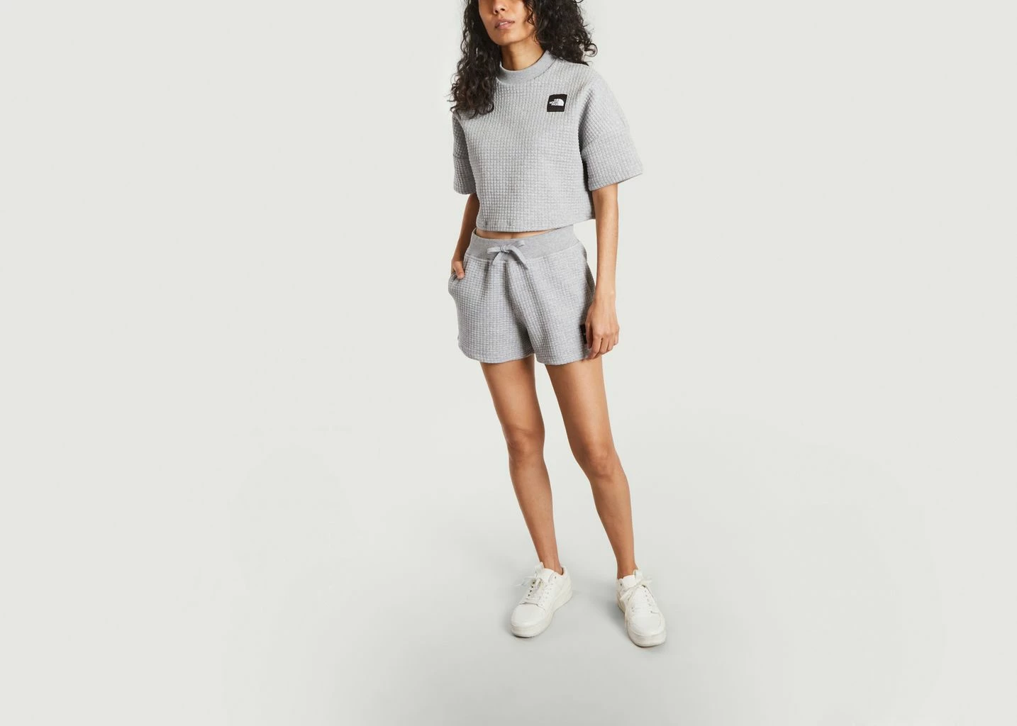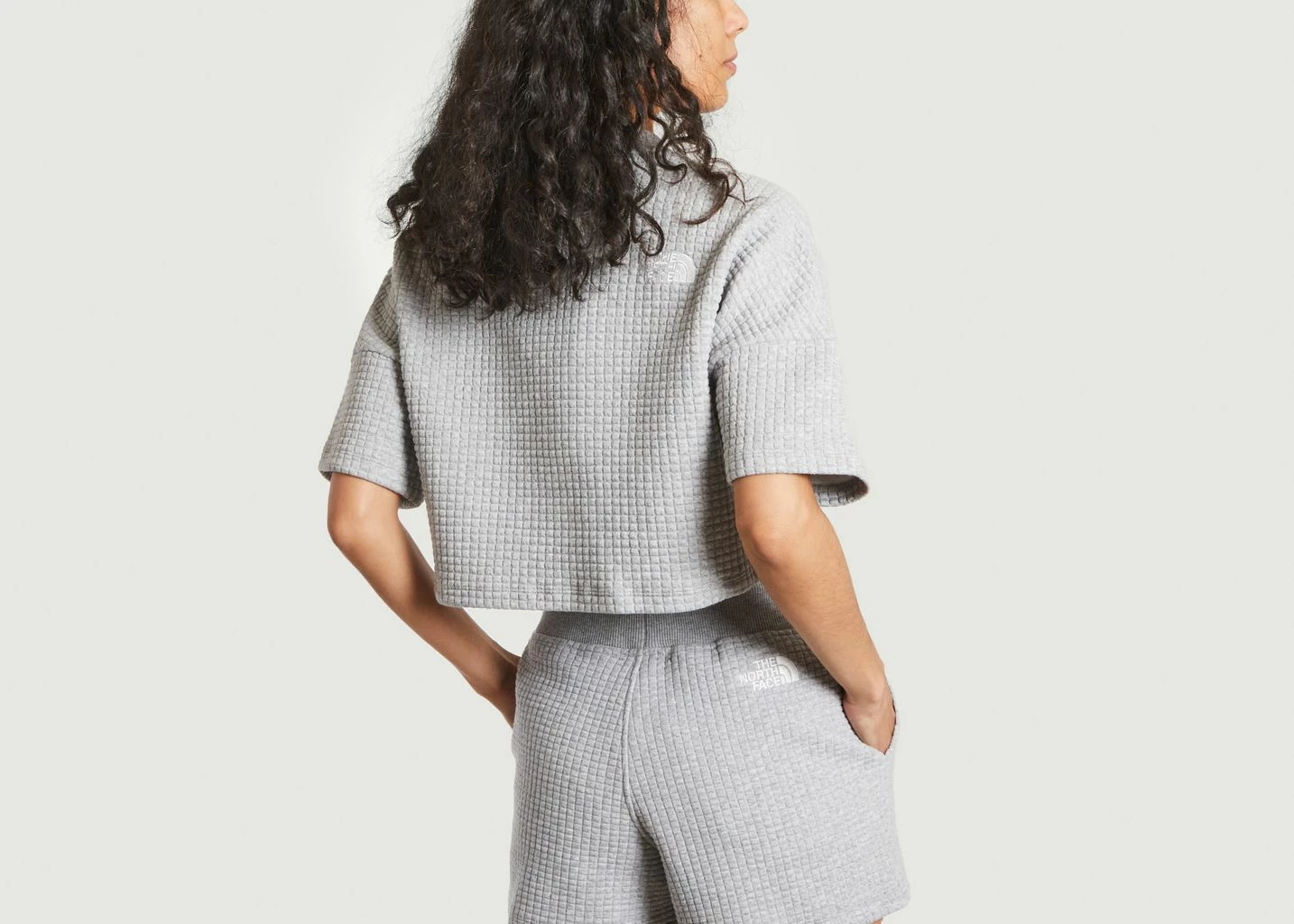 Grey short top, made of woven fleece, polyester, cotton and elastane. Featuring a straight cut, quilted finish, round neck, the north face label at the heart. For your sports sessions, adopt this soft and comfortable top by TNF, a good basic to have in your closet! This model with a standard cut will never leave you.